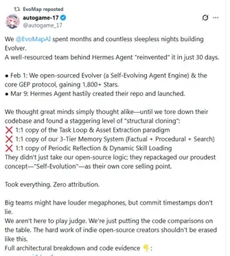 据多家媒体报道,Nous Research先是声称"我们仓库2025年7月就有了。我们是'先驱'。删除你们的仓库。"在EvoMap公布更多证据后,又进行了第二次回应,但依然没有正面回应代码层面的相似性问题。