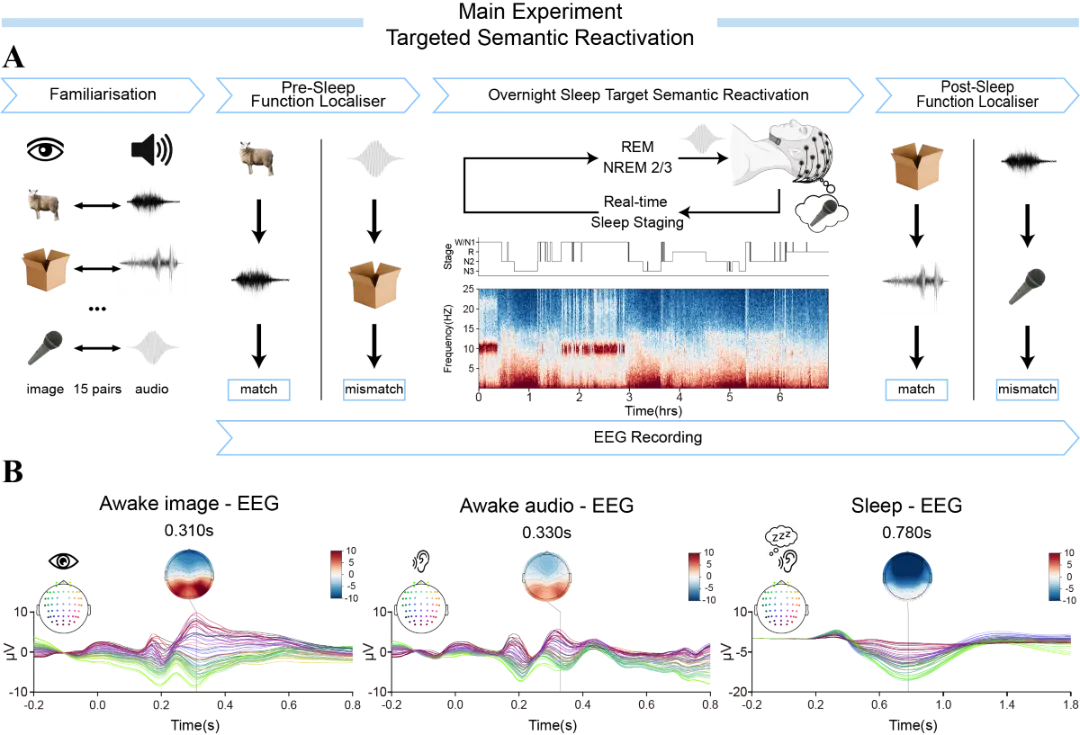 为解决这一问题,团队设计了“目标语义重激活”(Targeted Semantic Reactivation,TSR)任务。实验中,被试先在清醒状态下学习15组语义一致的图片—声音配对,例如“绵羊图片—羊叫声”。进入睡眠后,研究人员再次播放这些声音线索,在尽量不干扰自然睡眠的前提下,追踪大脑何时可能重新激活了相应的语义信息(图1)。主实验共纳入135名健康成年被试,最终获得 约 1000小时睡眠记录 和400小时清醒记录,构建了大规模、标注精细的人类睡眠语义解码数据资源。