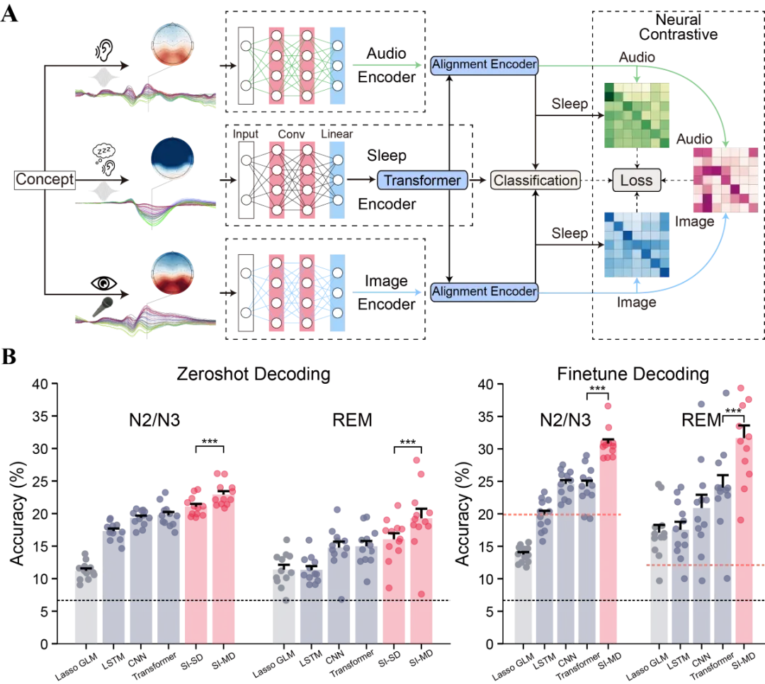 在方法上,团队提出了多域睡眠解码模型 SI-MD。可以把它理解为:让AI同时学习清醒时“看图”的脑信号、清醒时“听声音”的脑信号,以及睡眠中听到提示音后的脑信号,再把它们放到同一个语义空间里比较。这样一来,AI就能把“同一概念”在不同脑状态下的活动对齐,把“不相关概念”区分开,从复杂的睡眠节律背景中提取真正与记忆内容相关的信息。这也是AI+脑科学在睡眠研究中的一个关键进展。