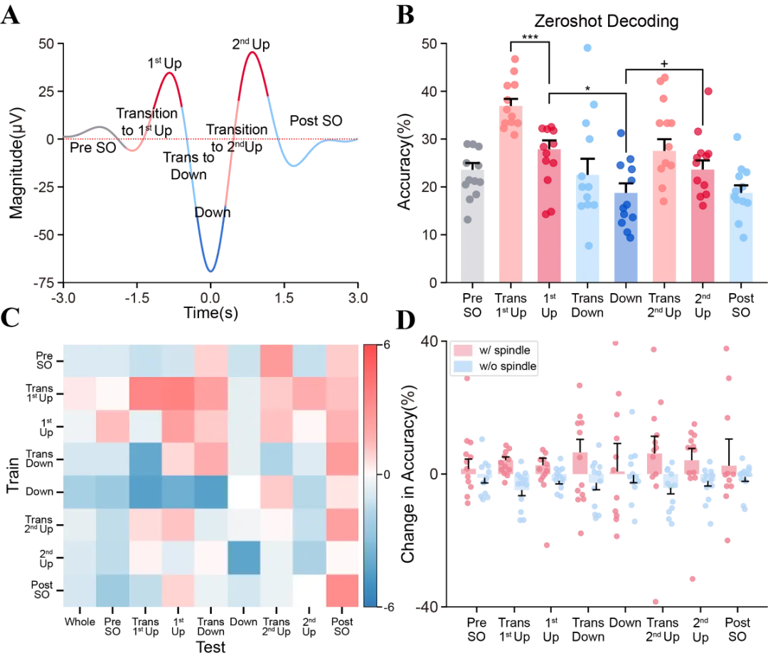 研究还进一步找到了睡眠中最有利于解码记忆内容的关键时间窗口。团队发现,解码效果并不是在整个睡眠过程中平均分布的,而是在慢振荡由下降相过渡到首次上升相时达到最高,也就是慢波活动即将转入上升的时刻。这个时间窗同时也是纺锤波最活跃、慢振荡与纺锤波耦合最明显的阶段。