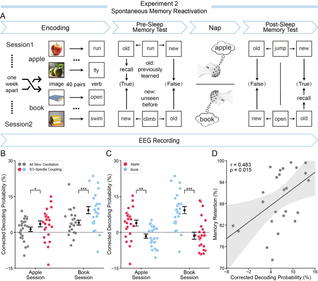 第一项实验采用经典的“目标记忆重激活”(Targeted Memory Reactivation,TMR)范式。与主实验不同,这一实验使用的是不携带语义信息的任意声音作为提示线索。结果显示,在不重新训练模型的情况下,SI仍能正确区分被提示的概念,而且解码概率与被试睡后的记忆提升相关(图4)。
