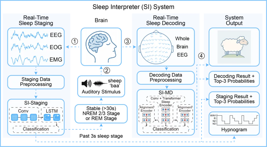 睡眠并不是大脑“关机”,而是大脑整理记忆、重组信息的重要阶段。这项工作是AI与脑科学深度交叉的一项新进展。研究团队提出了睡眠记忆解码框架 Sleep Interpreter(SI,“思”模型)。简单来说,它尝试让AI从睡眠脑电中读出与语义内容相关的神经活动,进一步判断睡眠中哪些记忆正在被重新激活。依托135名被试的大规模脑电数据,团队实现了跨被试、零样本语义解码。模型无需为每位新被试单独训练,也能在新个体上识别其睡眠中被重现的语义记忆信息。在此基础上,团队还搭建了可实时运行的睡眠分期与阶段特异性内容解码系统,为睡眠记忆研究、闭环睡眠干预,以及认知脑机接口的发展提供了新的方法学基础。