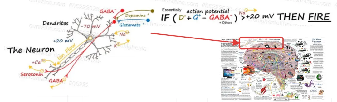 这张图的绘制故事也很有意思:大脑太复杂,脑科学研究者一般专注于自己的脑区或环路,受限于计算机能力或算力,很难画出信息密度这么高、内容这么全面的图,也未必能把当前市面上相关的 “工业级产品” 串联起来。因此,这两张图实际是由一位航天工程师(Space Shuttle Engineer)绘制的。