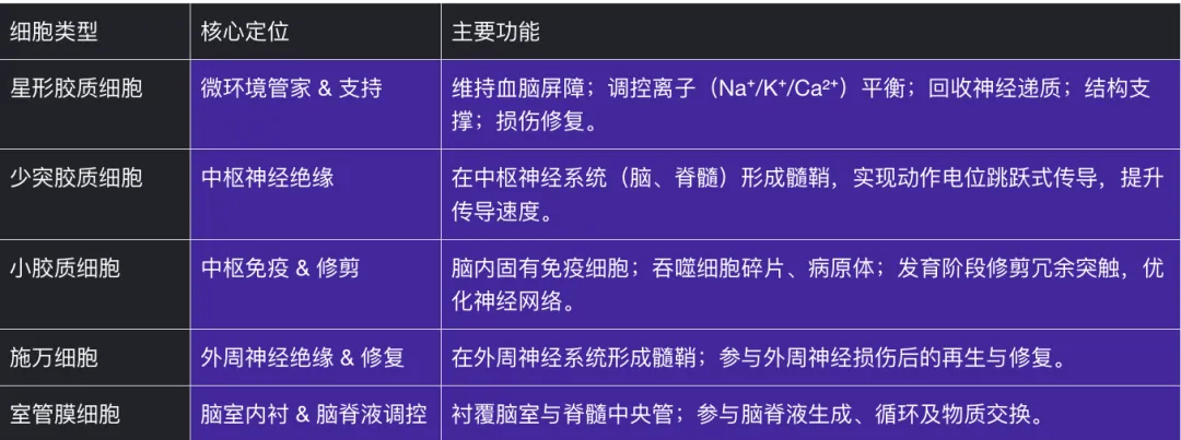 神经系统中,除了神经元细胞,还有神经胶质细胞。胶质细胞不直接产生动作电位,但它们是大脑的支撑系统、运维系统、供电系统、降噪系统、布线工程师。如下图描述。