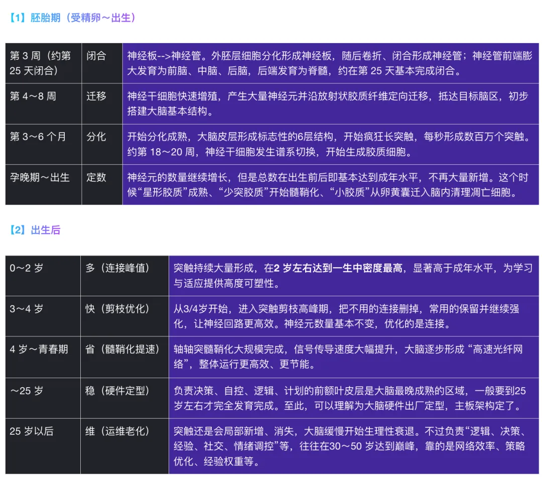 神经系统发育具体步骤挺有意思,在我们出生的时候,神经元的数目就是成年人的水平了,后续持续发育的是“连接”。连接会在2岁之前大量产生,一生中密度最高,之后是“剪枝”让神经回路更高效,4岁之后“髓鞘化”大规模完成,信号速度大幅提升。然后一直发育到25岁,负责决策、逻辑、自控的前额叶皮层,才稳定下来。再之后,大脑就是漫长的调整运维、逐渐衰老。