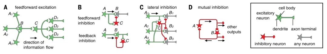 - 前馈兴奋:由兴奋性神经元串联形成区域间信号传递的主要通路,包含收敛式兴奋与发散式兴奋。前者可提高信噪比并实现选择性响应,后者可将同一信号分发至多条下游通路并行处理。