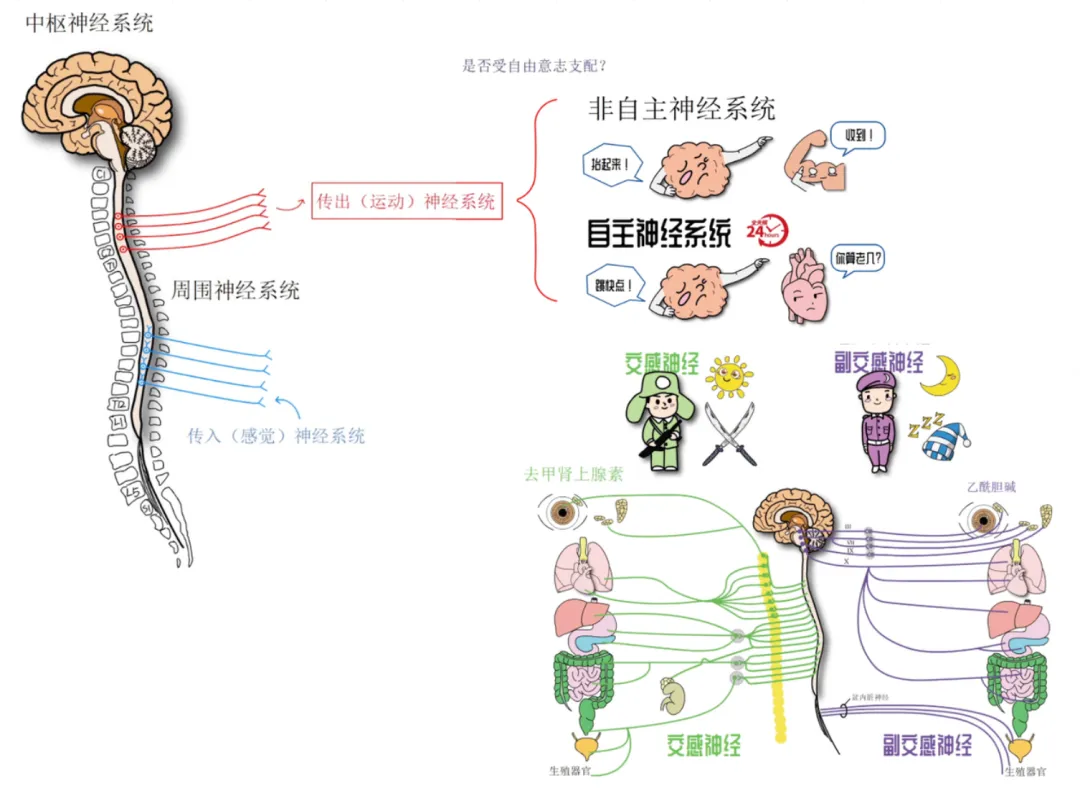 - 自主神经是说的器官自己工作,不受我们人意识控制,也叫植物神经 / 内脏神经,比如控制内脏、血管、腺体,心跳、呼吸、消化、出汗、瞳孔大小。