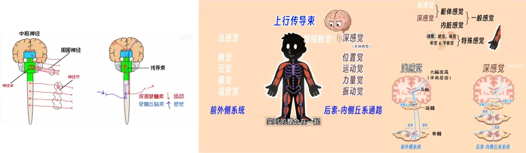 上行传导束(感觉:身体 → 脊髓 → 大脑),会上传很多信息。