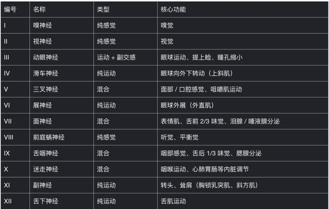 人头部有很多高级功能,所有高级功能都依靠12对脑神经的输入和输出,有点像12条专用总线。很多脑疾病、神经损伤需要了解,做仿生机器人也值得了解。