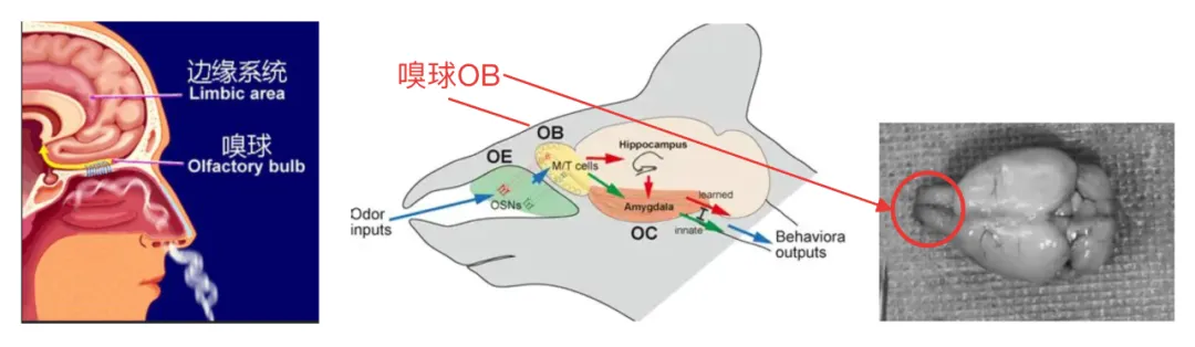 不过小鼠的脑子和人脑是有区别的。比如嗅球:视觉上小鼠的嗅球特别大,肉眼很明显能看到,占全脑体积≈2%;嗅觉是小鼠生存核心(觅食、求偶、避敌),所以嗅球极度发达。而人类(灵长类)嗅球扁平、贴在额叶底部、被大脑盖住,占全脑体积≈0.01%(几乎可以忽略);人类演化中视觉、语言、前额叶认知极度扩张,嗅觉系统退化(嗅脑退化)。