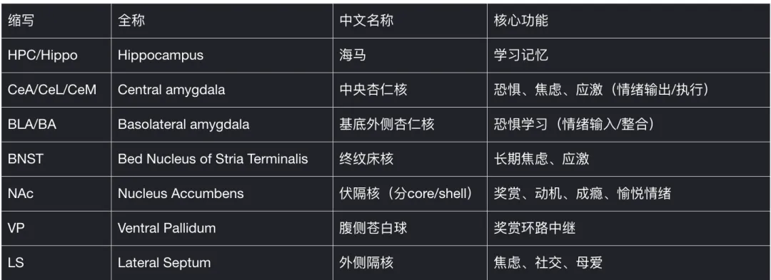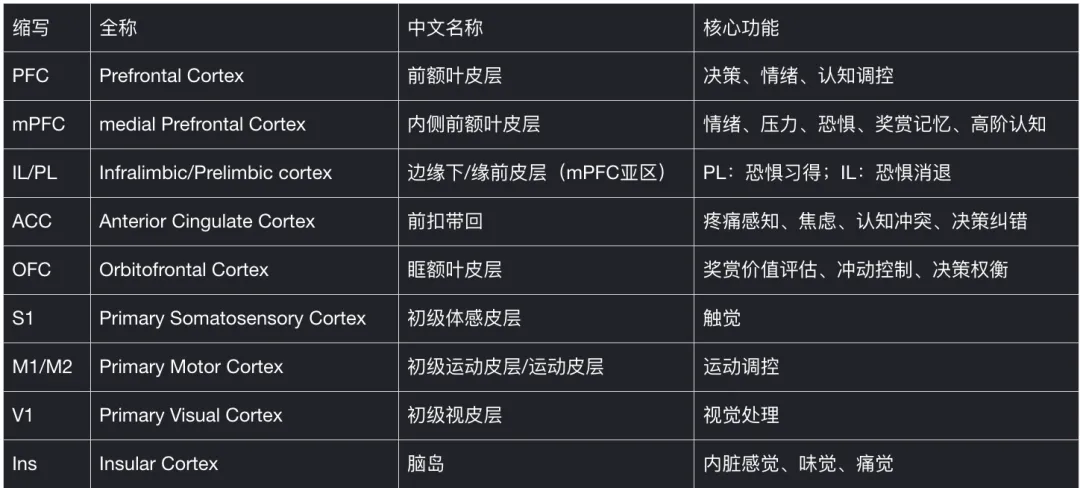 本章节表格很多,为了不进入语音阅读,就都是截图形式。请有需要看自己AI研究内容涉及脑区的,可以先大致浏览下,然后自行AI检索建议下,因为现在研究的都是环路,不是单脑区。