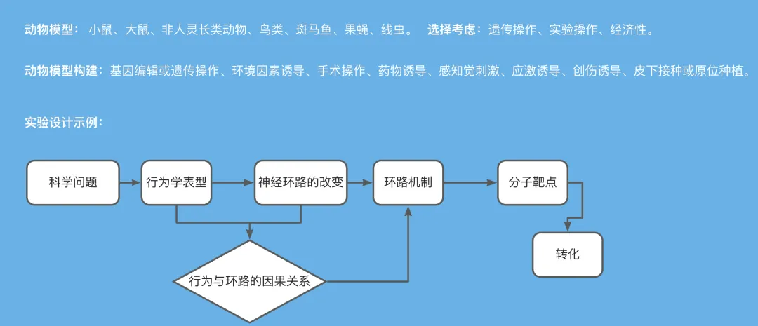 不管做什么实验,一定要考虑动物伦理,感谢这些小动物对人类科研的付出。考虑伦理,就得让实验不要浪费,所以需要提前考虑好自己实验的科学问题,然后通过“基因编辑或遗传操作、环境因素诱导、手术操作、药物诱导、感知觉刺激、应激诱导、创伤诱导、皮下接种或原位种植”等技术,建立动物模型,并合理设置对照系,进而观察行为表型与环路改变的因果关系,阐明其环路调控机制并挖掘潜在分子靶点。