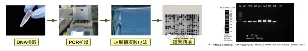 选中小鼠成为实验鼠后,要测基因型。选取小鼠后剪取尾尖或脚趾组织,加入裂解液与蛋白酶 K 充分裂解,水浴消化后离心,取上清液作为 DNA 模板。配制 PCR 反应体系,加入模板 DNA、上下游引物、Taq 酶及缓冲体系,短暂离心后置于 PCR 仪中进行基因扩增(将样本中微量的基因片段,快速扩增成千上万倍,以便检测)。扩增完成后配制琼脂糖凝胶,将 PCR 产物上样,电泳 15–20 分钟,最后在紫外成像仪下观察条带并判定基因型。整个过程耗时约4小时,因此都是一批一起做几十个。