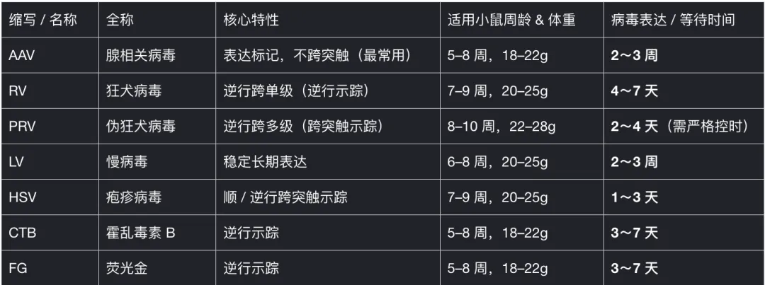 然后根据实验设计和PCR鉴定的基因型,选取合格鼠,养到合适体重后,使用脑立体定位仪打病毒。病毒注射的目的是通过病毒载体感染神经元,将目的基因递送入细胞内并实现表达,例如携带荧光蛋白基因以标记神经元、在 Cre 重组酶品系小鼠中实现基因的特异性开启或关闭、携带光遗传元件以实现光照调控神经元活性、递送 CRISPR 系统(Cas9+gRNA)以敲除或敲入目的基因,或携带示踪元件用于神经环路示踪等。
