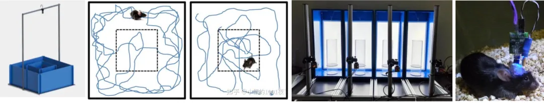 待病毒在小鼠脑内实现稳定表达后,即可开展系统性行为学检测。行为学范式类型多样,需依据科学问题与研究目的进行合理设计,并执行标准化的数据采集流程。常用经典范式主要涉及情绪相关表型,包括旷场实验、高架十字迷宫、强迫游泳实验等,要做出新结果,一般也需要设计新的实验范式。对于预先植入光纤的动物,可同步采集行为表现并实时记录光纤信号(如电生理信号、钙信号),结合光遗传操控手段,实现行为表型与神经环路活动的联合解析。