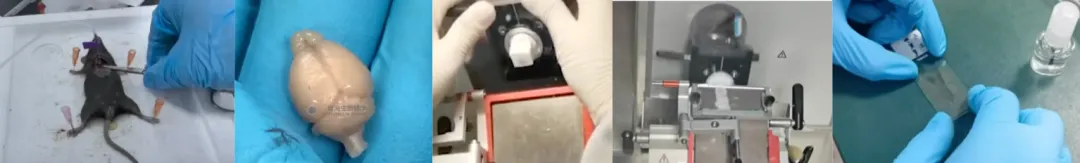 灌注完成后,剪开头皮和颅骨,取出全脑,剥离视神经等连接,于 4% 多聚甲醛中 4℃ 后固定 4–12 、h,随后依次经 15%、30% 蔗糖溶液梯度脱水至组织沉底。沉底后立即切片,或者OCT 包埋后 -80℃ 长期保存。