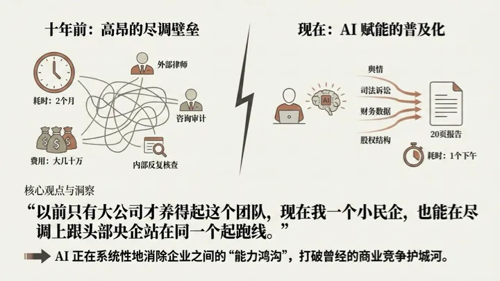 "现在我让手下一个小伙子,花一个下午,用 AI 把合作方近三年的舆情、司法诉讼、财务数据、股权结构全部扒出来,整理成一份二十页的报告。"