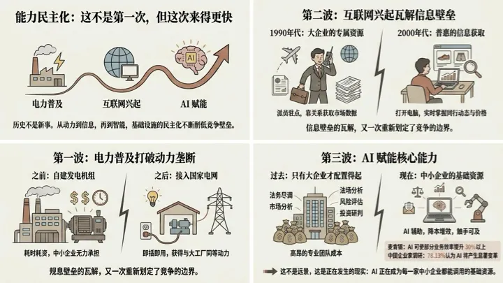 大企业靠规模建立的优势被削弱了;但另一方面,中小企业的劣势——缺乏专业人才、缺乏数据积累、缺乏系统性分析能力——也被 AI 填补了一部分。一个五人团队的小微企业,加载了合适的 AI 工具之后,在某些具体能力上可以与五十人的中型企业同台竞技。
