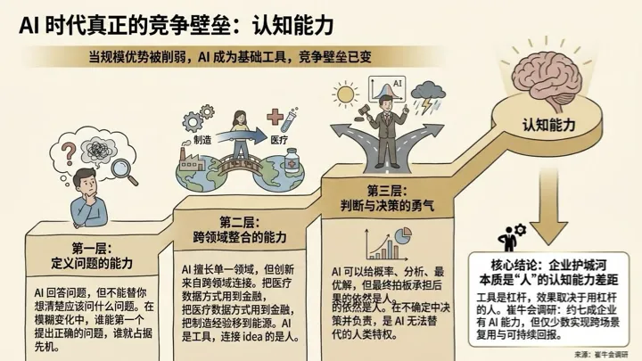 这三个能力有一个共同特征:它们都不来自工具本身,而来自使用工具的人和组织。 换句话说, AI 时代的企业护城河,本质上不是技术能力的差距,而是"人"的认知能力的差距。