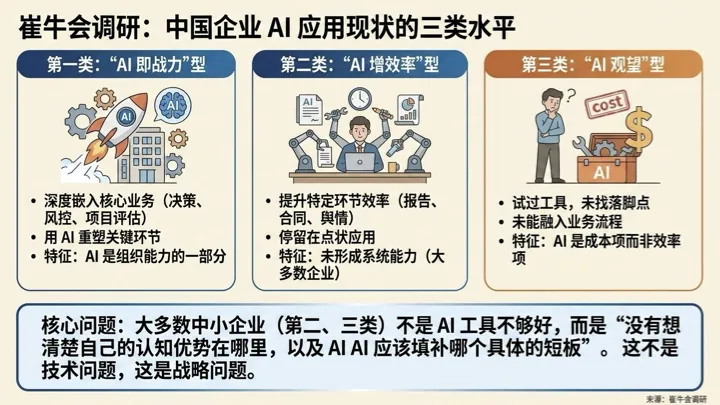 根据崔牛会对中国企业 AI 应用现状的调研,企业对 AI 的利用水平大致分为三类: