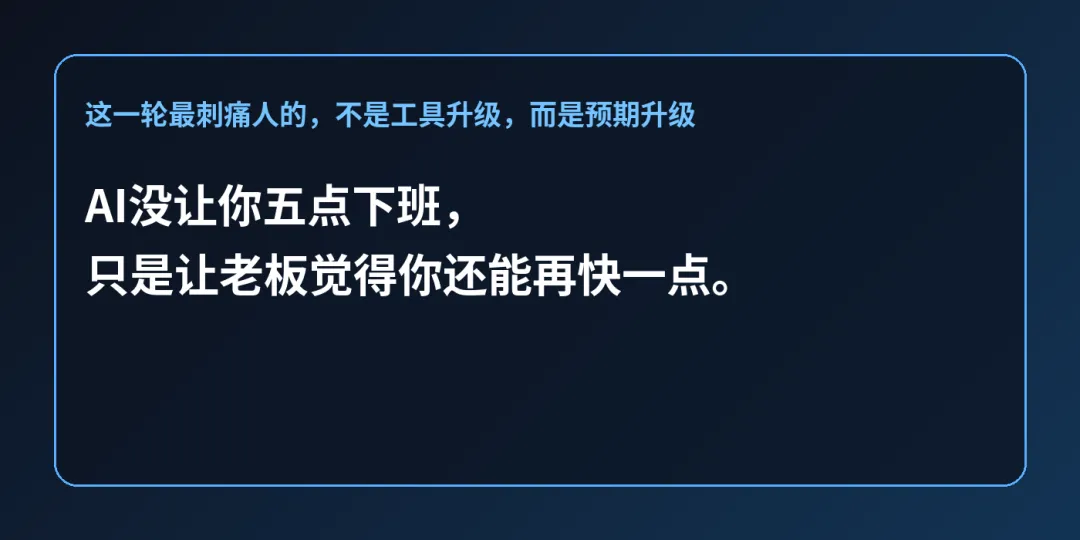 这也是为什么,越来越多人开始对“AI 提效”这四个字产生复杂情绪。因为真正的问题,从来不是工具本身,而是工具被管理层拿去重新定义人的边界。