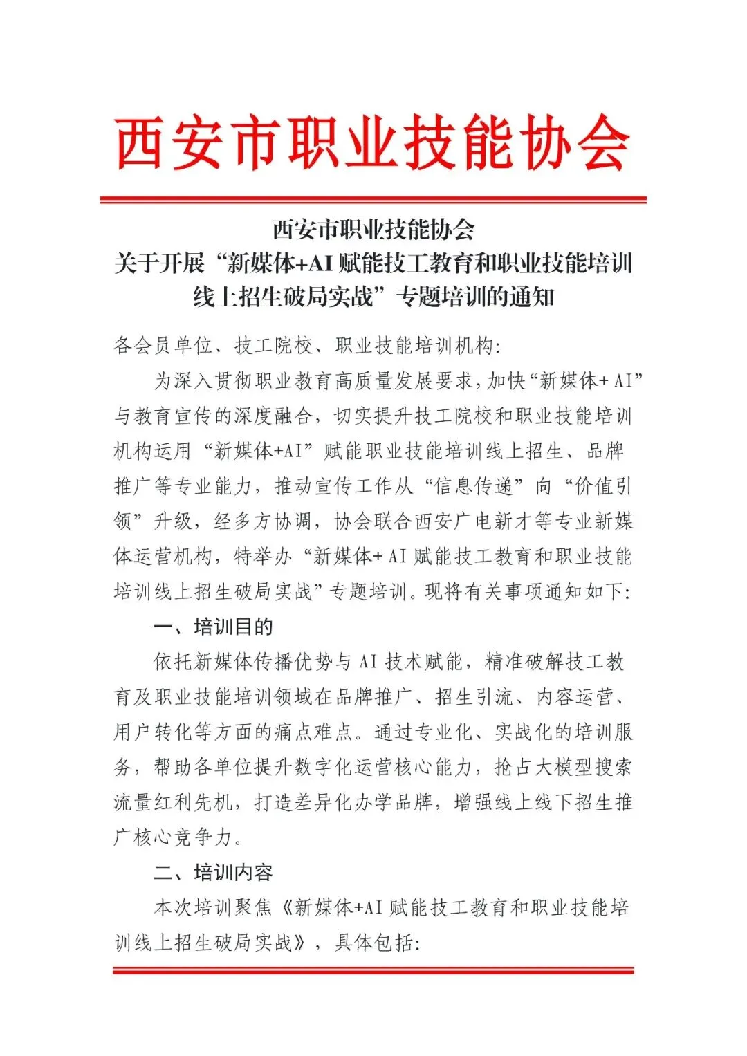 关于开展“新媒体+AI赋能技工教育和职业技能培训线上招生破局实战”专题培训的通知附件下载请点击下方阅读原文坚持“服务、自律、代表、协调”办会宗旨电 话:029-89163645 邮 箱:xvsa104@163.com---西安市职业技能协会秘书处--- 扫码关注获取更多信息