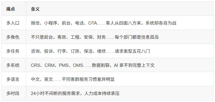 前台一套系统,客房一套系统,餐饮一套系统——AI 拿不到完整数据,就无法真正"理解用户"。