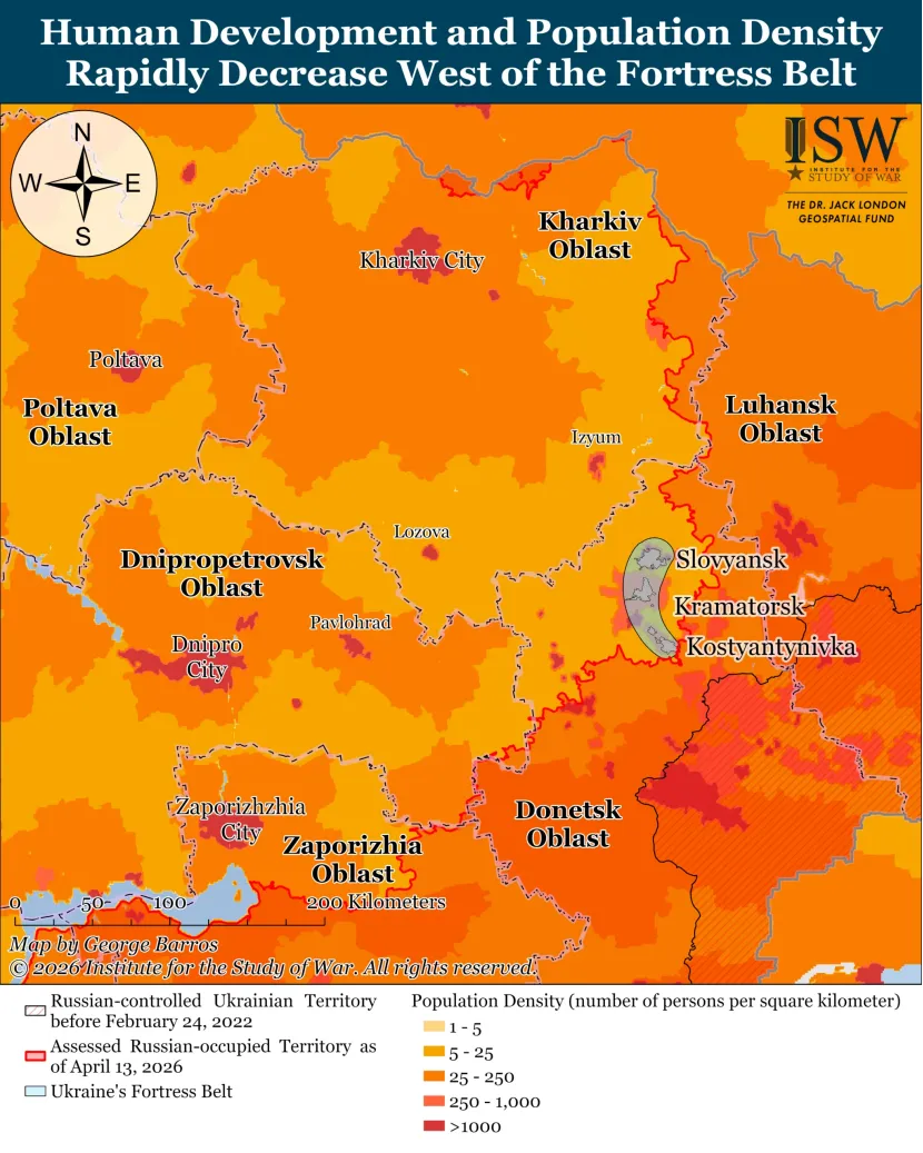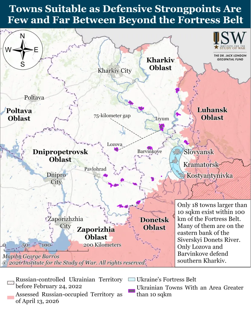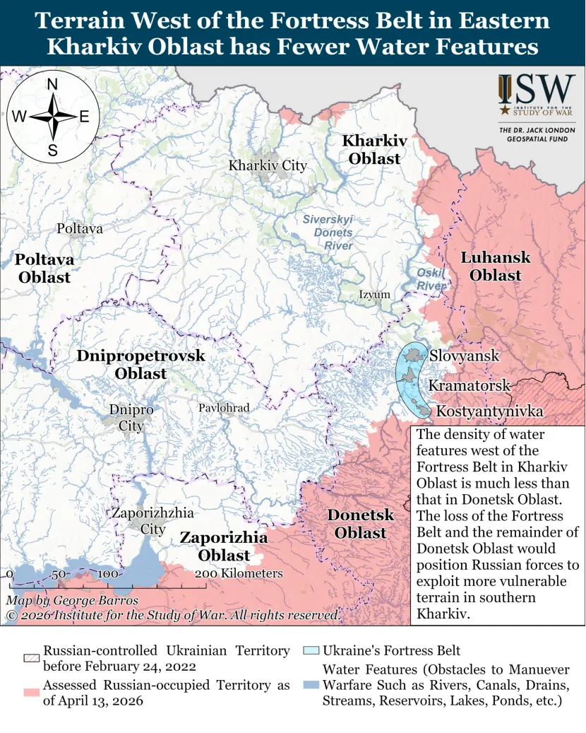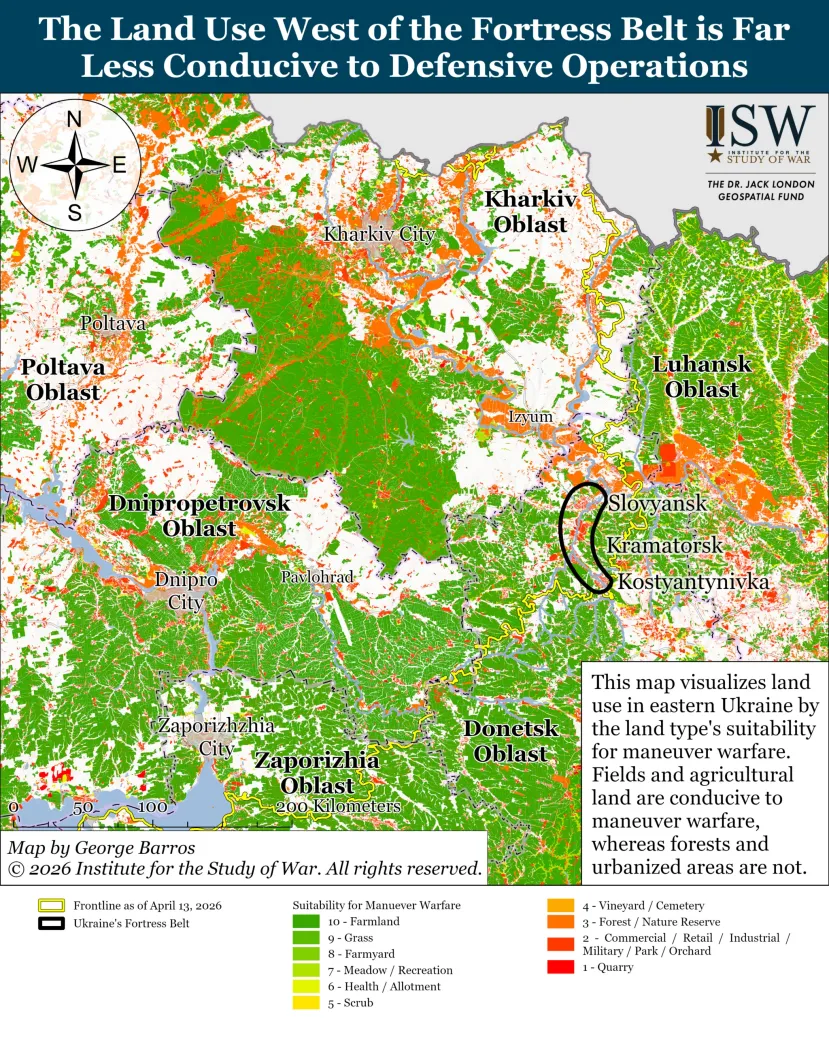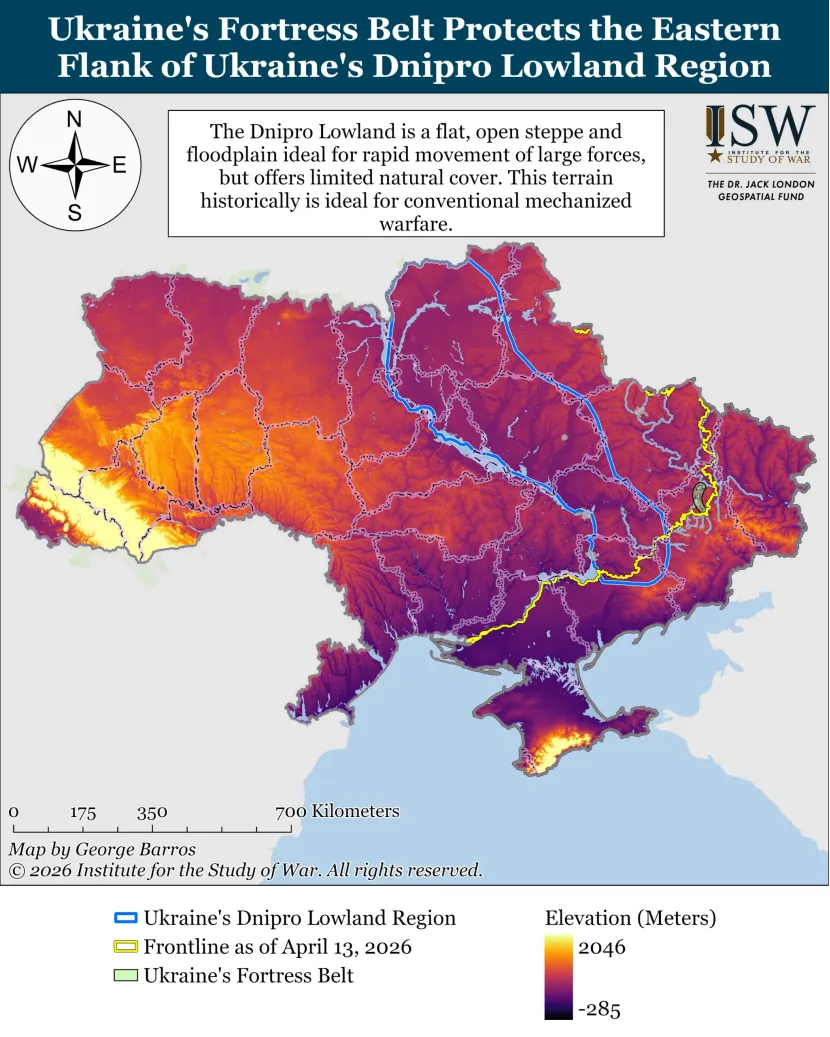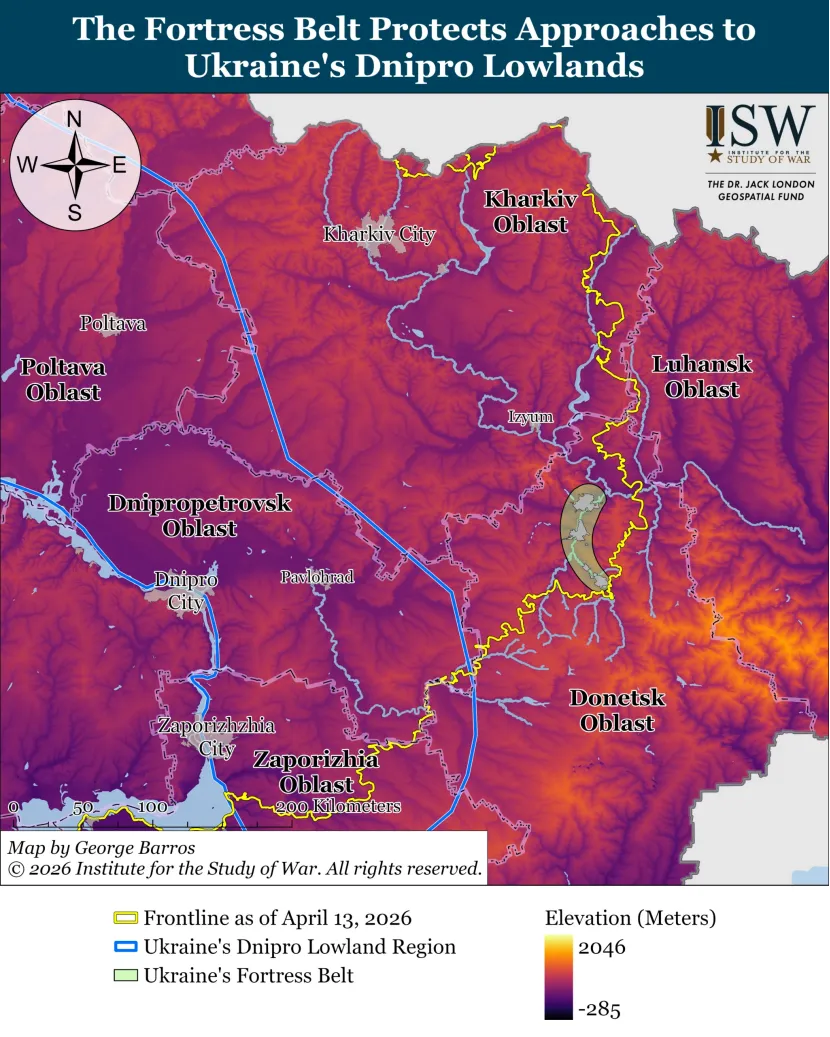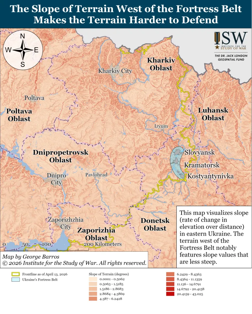 2026年4月14日,战争研究所发布文章《乌克兰堡垒带的重要性:地理空间情报地形分析》,乌克兰的“堡垒带”是乌克兰东部军事防御前线的基石。 “堡垒带”的地形几乎涵盖了所有与军事地形分析相关的地形和地理特征,使其具备了最佳的防御能力。