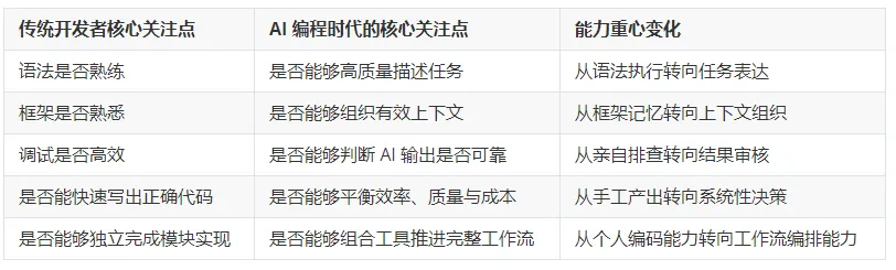 开发者能力的迁移,不应理解为旧能力失效,而应理解为能力边界被重新扩展。语法、框架与调试仍然是基础能力,但在 AI 编程环境中,仅依赖这些能力已经不足以支撑高质量开发。开发者还需要具备任务表达、上下文组织、工具选择、结果校验和风险判断等新的能力要求。