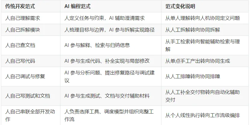 备注:AI 编程的新范式,本质上是软件开发从“开发者单线完成全部过程”转向“开发者定义与控制、AI 参与实现与推进”的协作式生产方式。
