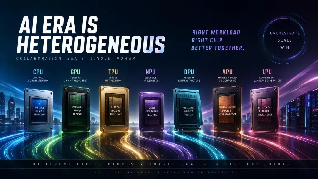 很多团队一聊 AI 基础设施,第一反应就是"是不是该多买点 GPU"。到了 2026 年,这个问题已经过时了。真正成熟的 AI 系统,不是押注单一算力,而是运行在一套异构芯片组合之上——CPU 负责控制与编排,GPU 负责训练与高吞吐推理,TPU 负责垂直优化的张量计算,NPU 负责端侧低功耗 AI,DPU 负责网络、安全与基础设施卸载,APU 负责统一内存协同计算,LPU 负责低延迟语言生成。未来的竞争,不是谁 GPU 最多,而是谁最会调度这些不同的芯片。