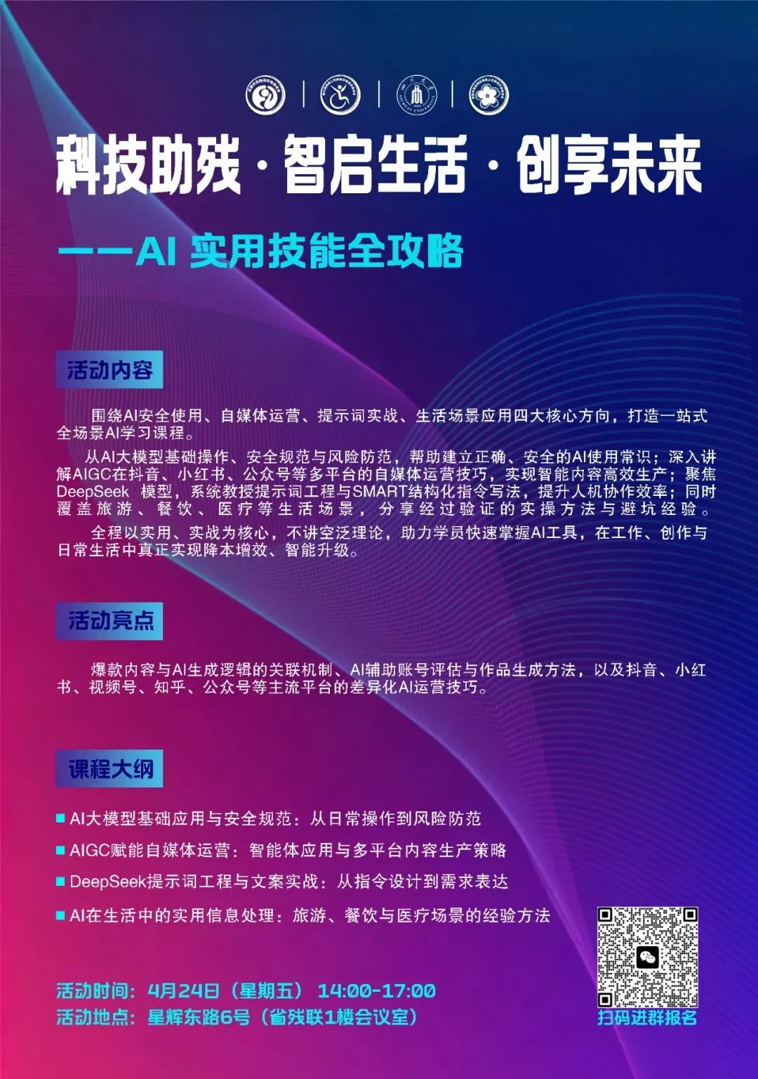 科技助残·智启生活·创享未来——AI实用技能全攻略,公益培训报名AI大模型技术正在重塑就业形态与生活方式。对于残疾人而言,AI既是高效辅助的“数字义肢”(如语音转文字、图像识别),也是实现居家就业(如自媒体运营、数据标注)的关键工具。本次培训由四川省残疾人无障碍环境建设促进会联合四川大学软件学院共同开展,旨在通过“高校技术下沉+社会组织动员”的模式,让残疾人朋友不仅“会用”AI,更能“用好”AI,切实提升生活质量与职业竞争力。