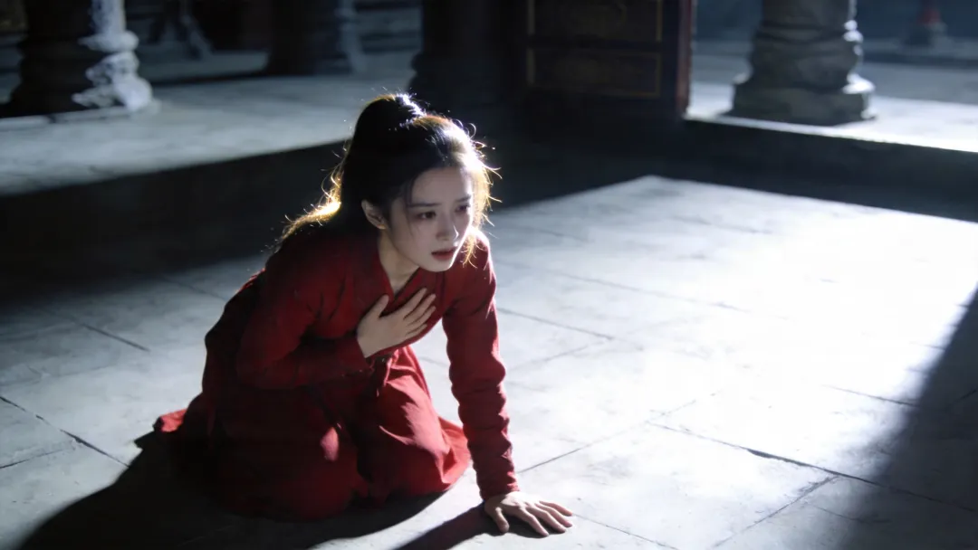 中景 | 俯拍 | 斜侧 | 35mm | 侧逆光 | 高反差 | 红衣少女跪地喘息 | 两仪宗大殿 | 清冷4800K | 仙侠肃杀生成一张16:9尺寸的红衣少女中景图片,高机位俯视拍摄,机位斜侧偏角30度,中景构图。画面主体是红衣少女跪坐在地上,一手撑地,另一手捂着胸口,正在喘息,少女位于画面中间偏左。