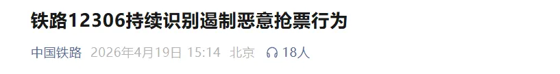 4月19日,“中国铁路”发布消息,铁路12306持续识别遏制恶意抢票行为,努力营造公平公正的购票环境。