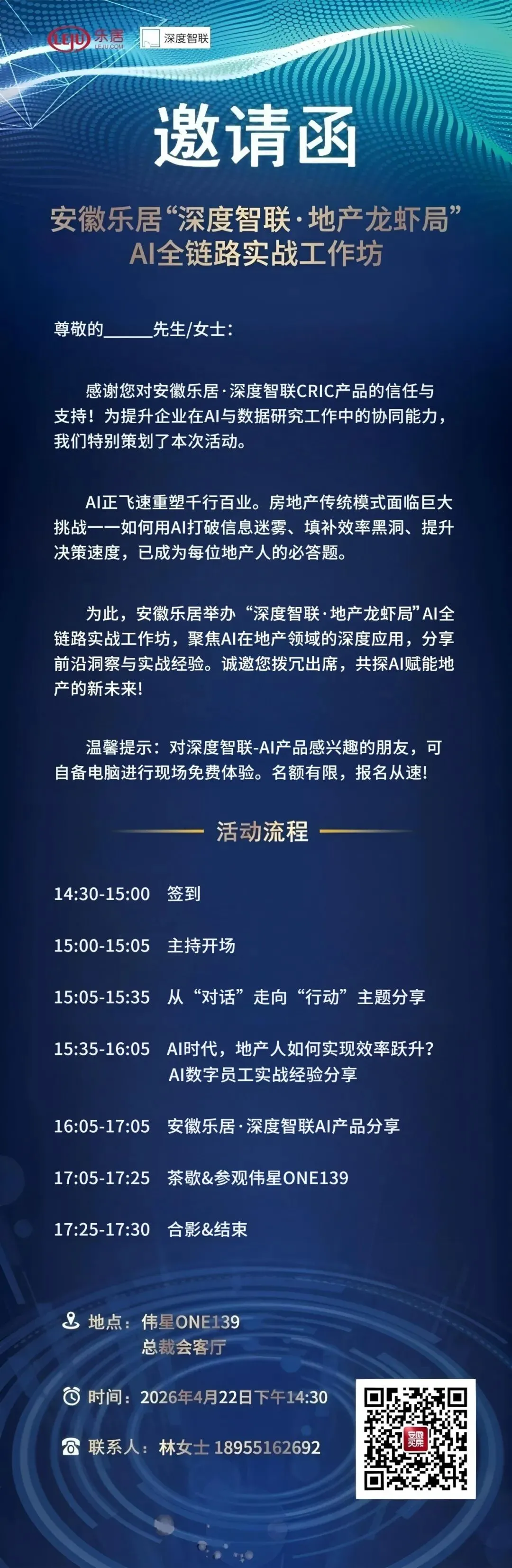 ✅ 16:05-17:05 安徽乐居・深度智联 AI 产品专属分享!深度拆解深度智联 CRIC 全系列 AI 产品功能,全方位展示 AI 在地产市场研判、数据洞察、内容生产、精准营销、运营管理等场景的强大能力,解锁专属数字化生产力武器。