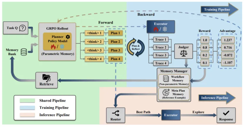 当前多数智能体存在 “失忆式工作”问题,记忆增长却难以转化为智能。上海创智学院与华东师大团队提出Memory Intelligence Agent(MIA)框架,采用Planner–Executor–Manager架构与双记忆机制,通过交替强化学习实现规划与执行协同,搭配开放世界自进化能力。实验中,MIA显著超越主流大模型及现有记忆方法,在多类深度研究任务中刷新SOTA,实现经验到能力的闭环进化,为智能体持续学习提供全新路径。