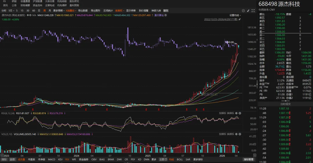 代币消费看起来是虚拟的,但每一次模型推理最终都要落到电力、服务器、光模块和数据中心的物理世界。这条逻辑链条上,A股硬件公司已经率先兑现了财务报表。中际旭创2026年一季度营收195亿元,同比增长192%,归母净利润57.4亿元,同比增长262%。新易盛预计2025年全年归母净利润94亿至99亿元,同比增长超过231%。源杰科技2025年营收6亿元,同比增长138.5%,净利润1.91亿元,扭亏为盈,数据中心业务收入占比超过50%——4月17日,它的股价一度超过贵州茅台,成为A股新「股王」。