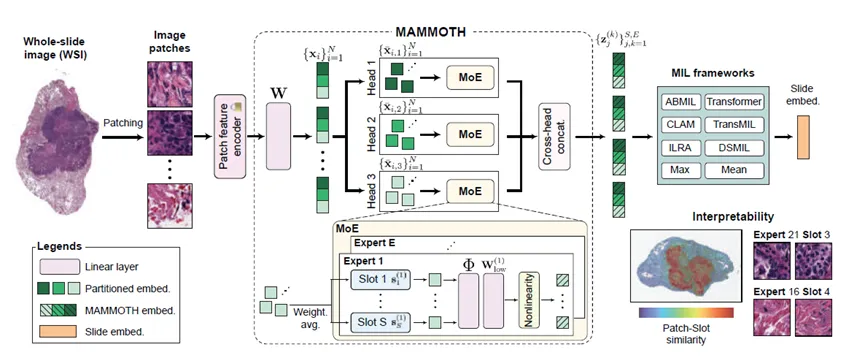 MAMMOTH的核心思路是:用多个小而专的专家模块,替代对所有切片一视同仁的单一线性层,让不同成分获得更合适的变换。在具体实现上,它针对病理场景做了多重优化。