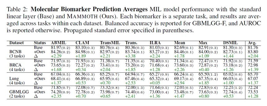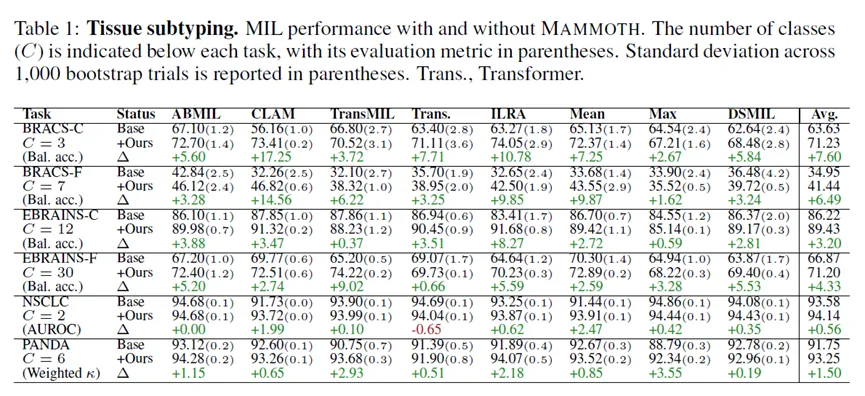 在形态学分类任务中,作者评估了6个任务、8个测试队列、8种MIL方法。结果显示,48个MIL配置中有46个在加入MAMMOTH模块后性能获得提升,平均提升幅度较为可观。