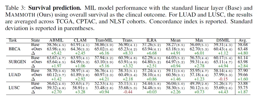 当然,MAMMOTH的提升也有边界。比如在NSCLC这种相对简单、基线已经很高的二分类任务上,提升就比较有限,个别配置甚至略有下降。这说明 MAMMOTH并不是一个对任何任务都能大幅加分的万能模块。它更适合那些形态异质性较强、任务相关信号需要从复杂patch组合中提炼出来的场景。对于已经接近饱和的简单任务,它的空间自然会小一些。