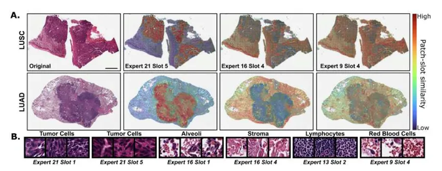 文章的可解释性分析也增加了说服力。作者通过可视化patch到不同slot的路由权重,让两位病理专家对结果进行观察,发现模型确实倾向于将肿瘤、间质、肺泡、淋巴细胞、红细胞等不同形态学成分分派到不同槽位和专家中。这至少说明,MAMMOTH的“专家分工”并非只是抽象设想,而是与可辨识的组织学概念之间存在一定对应关系。