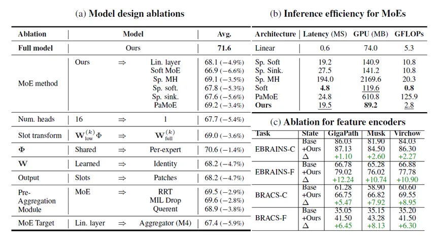 在消融实验中,作者系统比较了不同专家混合形式、是否采用多头、是否使用低秩专家、是否共享矩阵、是否保留slot级输出,以及与其他聚合前处理模块的差异。整体结果非常一致:完整版本的MAMMOTH最优,各个关键组件都对性能有贡献。这也说明,这篇文章的价值不是来自某一个单独的技巧,而是来自一整套围绕病理MIL场景重新组织后的结构设计。