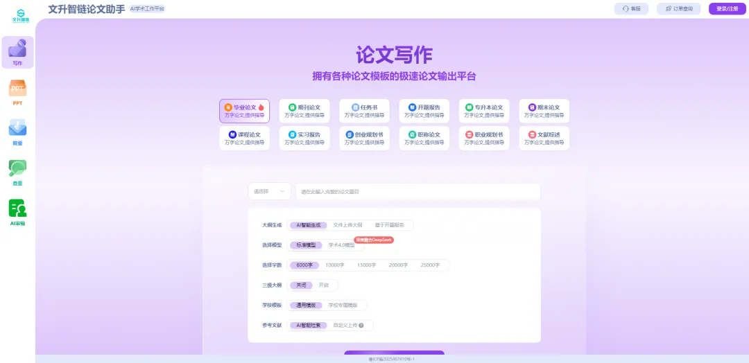 这个平台功能超多。重点说说“AI学术写作”,它有毕业论文、期刊论文、课程论文等9个论文品类,还支持标准模型、学术4.0模型两种AI模型,不管写啥论文都能搞定。AIPPT板块也超棒,输入内容主题,就能一键生成专业高效的PPT文件,简直是懒人福音。