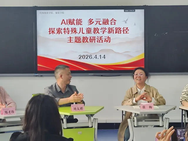 2026年4月14日,我院特殊教育、教育康复学教研室及残疾人教学部在A503教室与广东省刘太祥名师工作室联合开展教研活动,共同探讨人工智能技术在特殊儿童教学中的应用,促进特殊儿童教育教学的多元融合发展,活动由院长张梅主持。