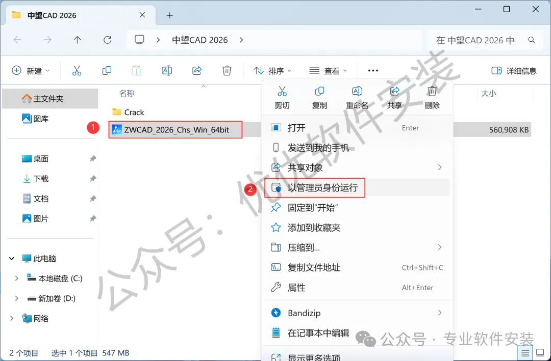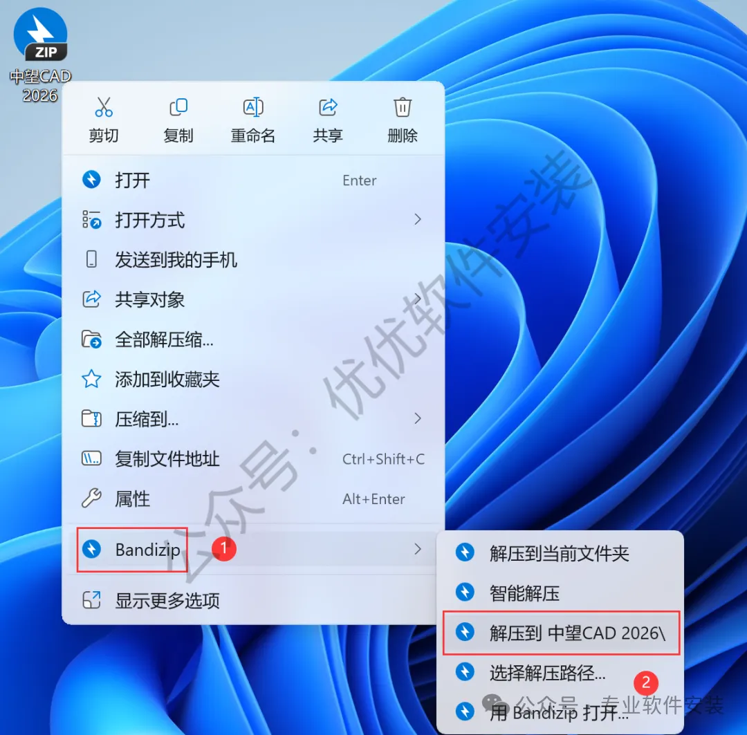 1、下载中望CAD 2026软件安装包到电脑上,右键选择【解压到中望CAD 2026\】