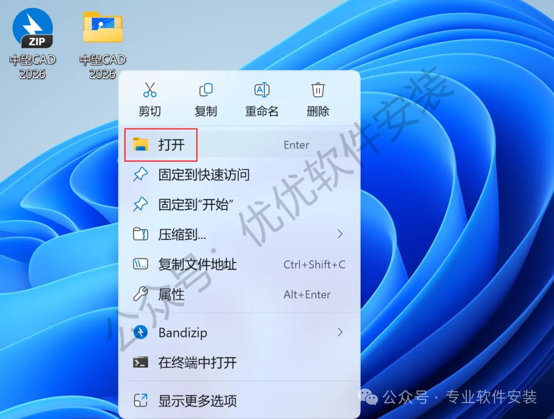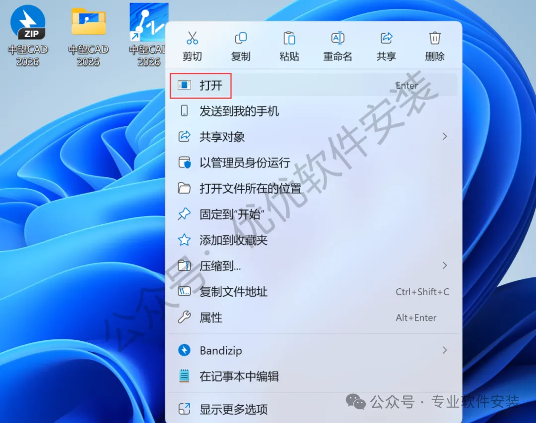 18、回到桌面,右键桌面上的【ZWCAD 2026软件图标】,点击【打开】