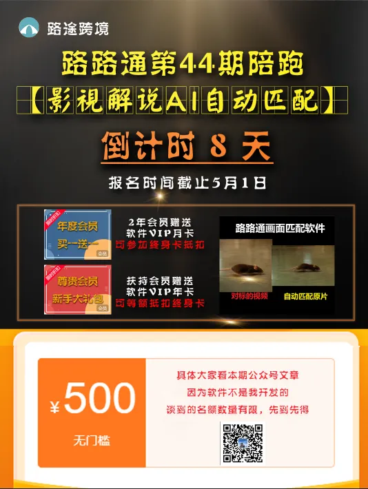 从去年9月跟大家推荐以来,几乎所有人,包括我自己也认为这个软件真的很好用,而且价格也很合适,比起省下来的功夫,已经是相当划算了。没错!我谈下来了,这一期的福利,就是给大家争取到了终身卡!而且价格很便宜,跟之前VIP的年卡原价差不多。已经在社群的小伙伴,可以在群里发送@小助理 画面匹配 直接查看有些之前一直买月卡的小伙伴可能会想,早知道我晚点买好了!亏大了!1、如果之前买了月卡的,想参加终身卡,可以抵扣一次月卡费用2、如果之前买过年卡的,因为原来的年卡本来就很优惠了时间也很长,还需要买终身卡的,给大家谈的是350元代金券一张3、以上方案有效期截止到5月1日。(到期以后就是抵扣活动没了,终身卡还在)虽然上周咱们刚结束43期AI漫剧的陪跑,正好很多小伙伴也想再开一次影视解说陪跑。那么正好借着这次活动,咱们44期陪跑就给大家再开一期影视解说这一期的陪跑形式我打算再做一个小创新,进一步提高大家的执行力。每个参与本期陪跑的小伙伴都必须使用软件完成特定任务,具体的大家看本期的陪跑细则哈,这两天会发在群里。所以本期陪跑新加入社群的小伙伴,或者续费的,也给大家准备了活动一共10个名额,赠送匹配软件VIP月卡一张,如果想要终身卡,可以参与上方抵扣活动一共3个名额,可以申请社群终身有效期,另外还赠送自动匹配软件VIP年卡一张,如果想要终身卡,也可以参与上方抵扣活动之前跟大家讲过,软件并不是我开发的,所以赠送成本很高,这次活动的名额也是固定的,如果需要的小伙伴先到先得咯~新来的朋友