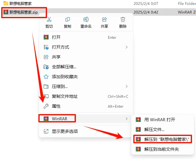 1.选中下载的压缩包,然后鼠标右键选择解压到“联想电脑管家”(列表中没有解压选项点这里)
