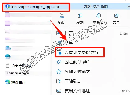 2.打开刚刚解压的文件夹,鼠标右键点击“lenovopcmanager_apps.exe”选择“以管理员身份运行”