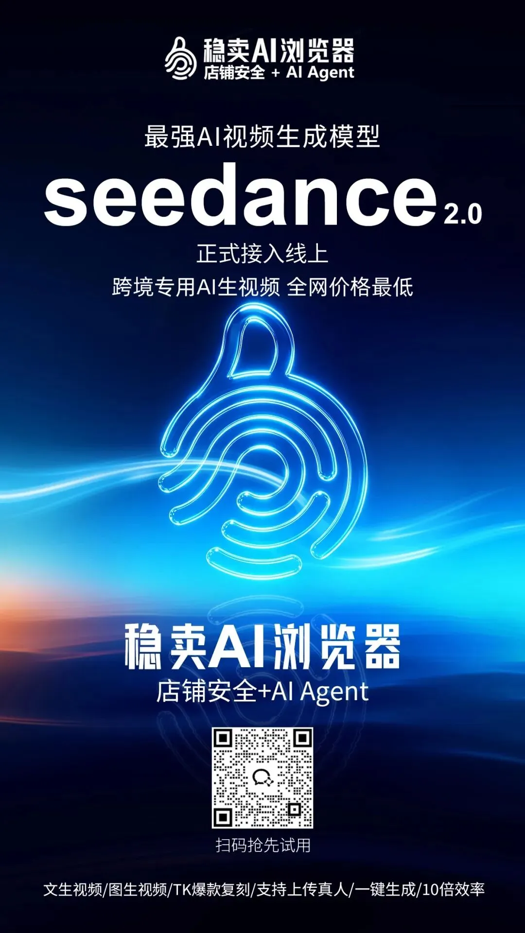 稳卖AI浏览器: Seedance 2.0上线,30-60秒即可生成一段4-15秒的高质量视频,适配TikTok、亚马逊等多平台快速上新,效率较传统模式提升10倍以上。
